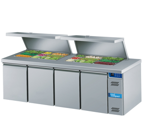 Saladette, 4- türig GN 1/1, Zentralkühlung Saladetten-Ausschnitt mit jeweils 2 x GN 1/1 + 1 x GN2/4 mit Tischplatte allseits abgekantet, inkl. Klappdeckel