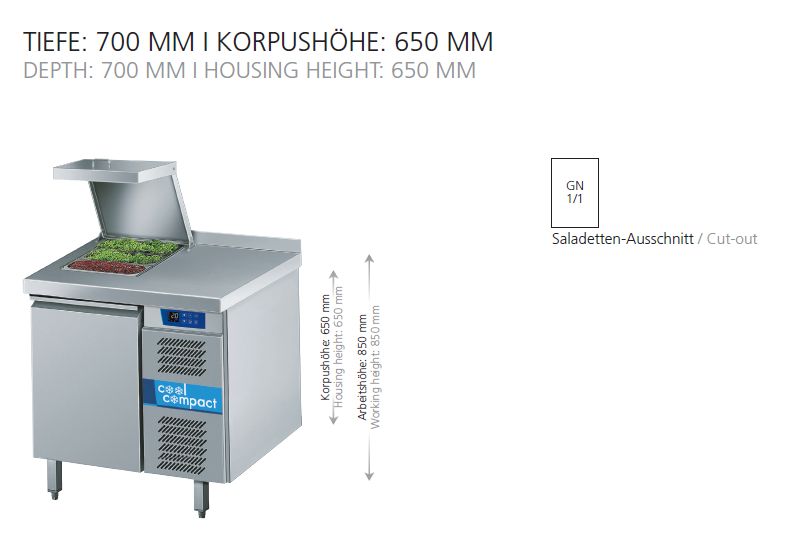 Saladette GN 1/1 Profondeur : 700 mm Hauteur du corps : 650 mm 1 porte